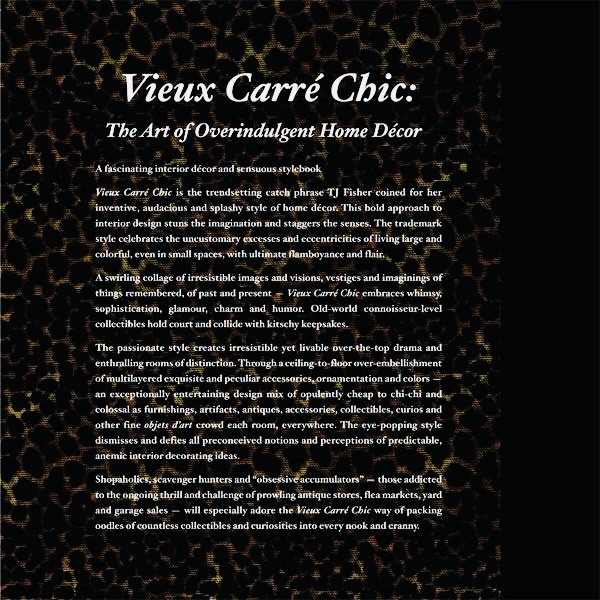 From the published back cover: A fascinating interior décor and sensuous stylebook. Vieux Carré Chic is the trendsetting catch phrase TJ Fisher coined for her inventive, audacious and splashy style home décor. This bold approach to interior design stuns the imagination and staggers the sense. The trademark style celebrates the uncustomary excesses and eccentricities of living large and colorful, even in small spaces, with ultimate flamboyance and flair.